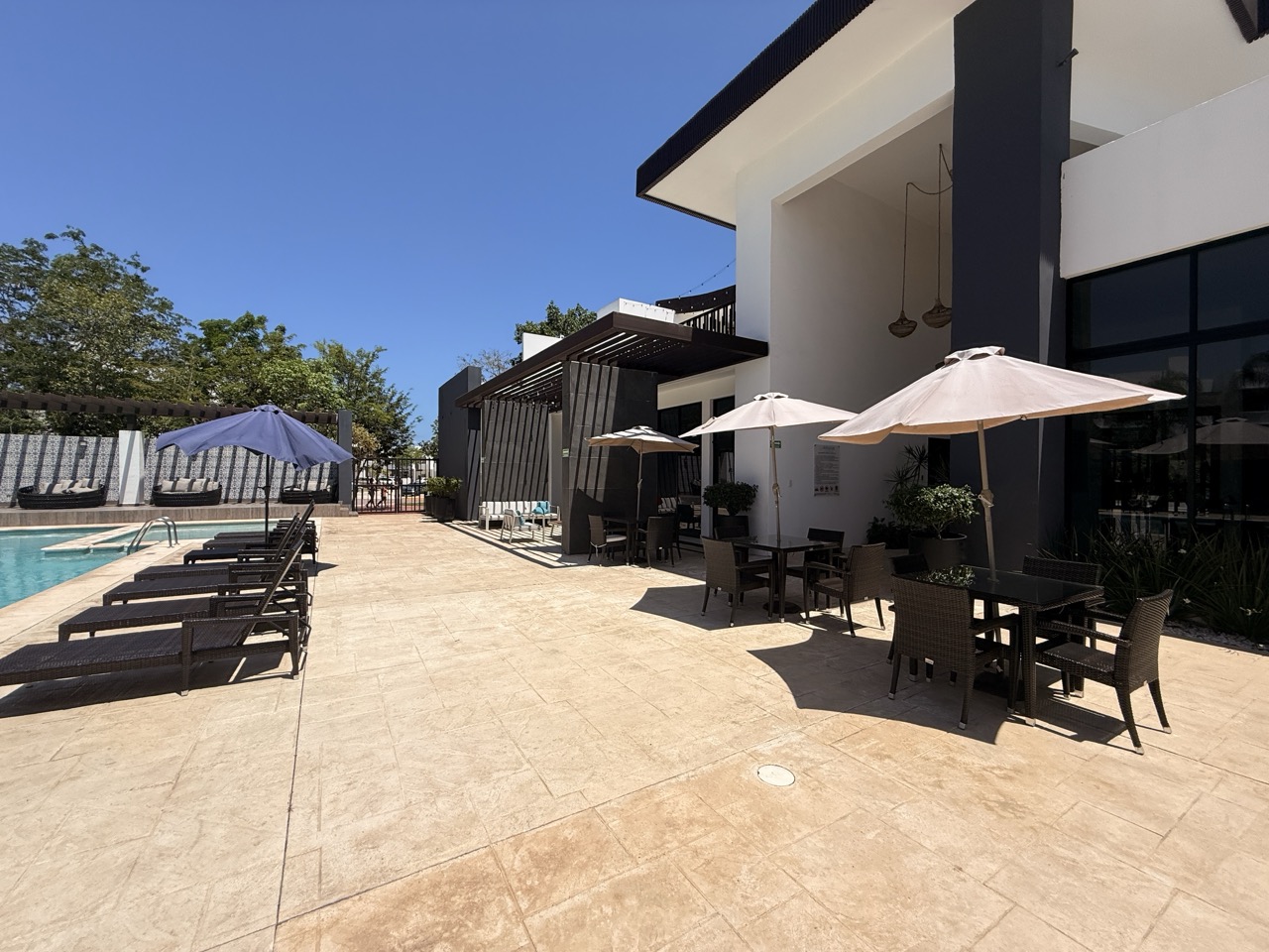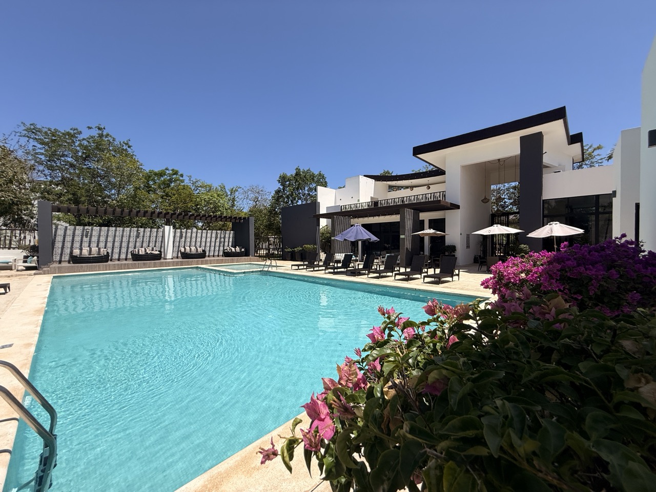 • Water Facilities: Large swimming pool, children’s wading pool, solarium with lounge chairs, and showers.