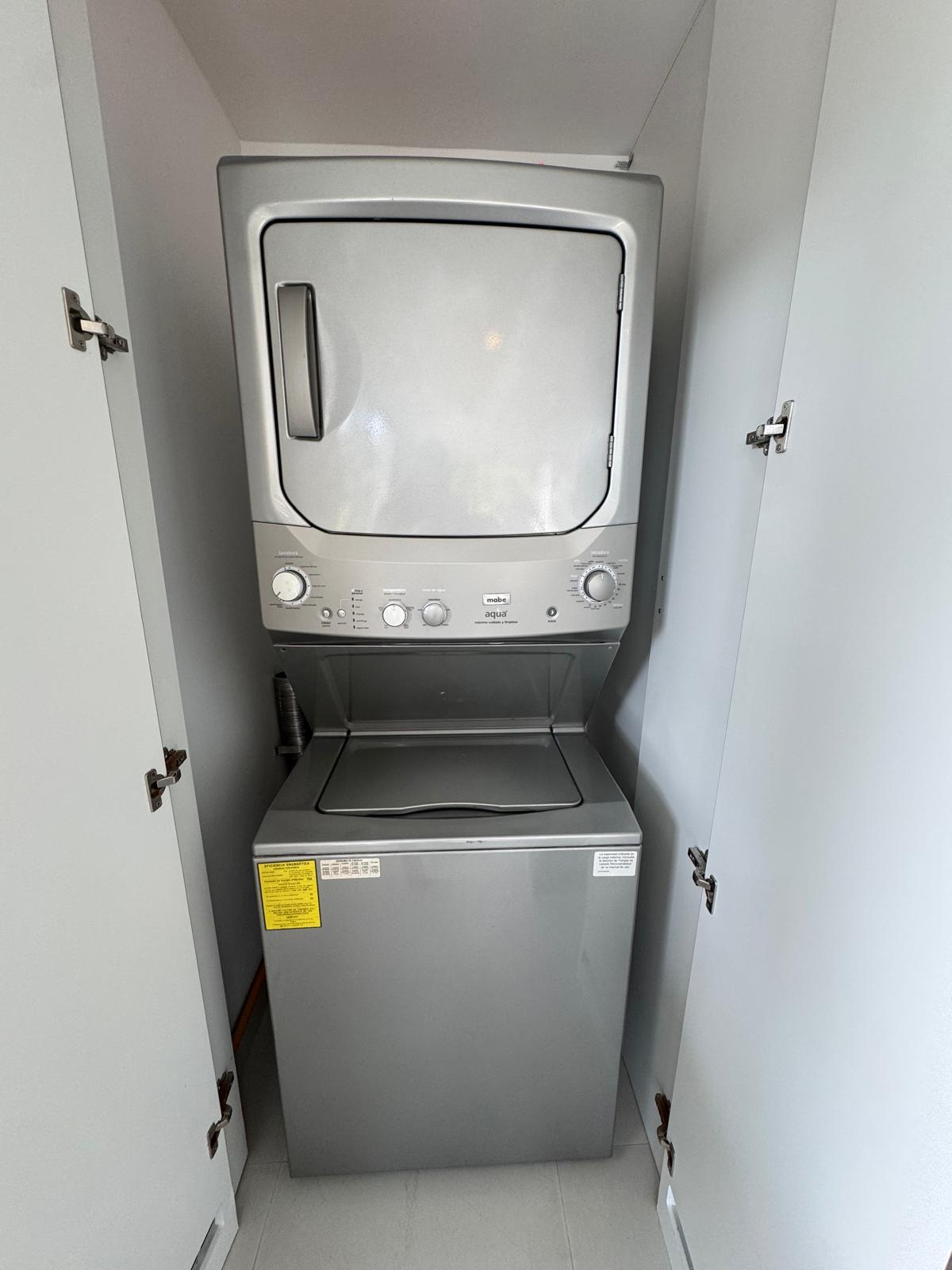 This spacious and modern 2-bedroom, 2-bathroom residence features an open-concept layout, generous closet space, and a well-appointed kitchen with granite countertops, full-size appliances, and a convenient breakfast bar. The kitchen also includes a laundry closet with a washer and dryer.