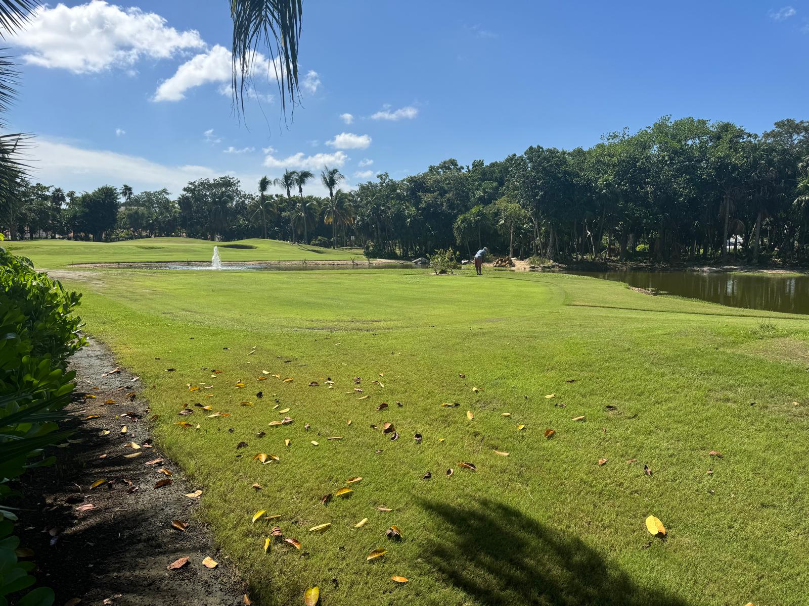 The open-concept living area seamlessly connects the welcoming foyer, living room, dining area, and a fully equipped kitchen. Large glass doors open to a covered terrace — the perfect space for outdoor dining or relaxing — leading to a beautiful garden and private pool that overlooks the lush golf course.