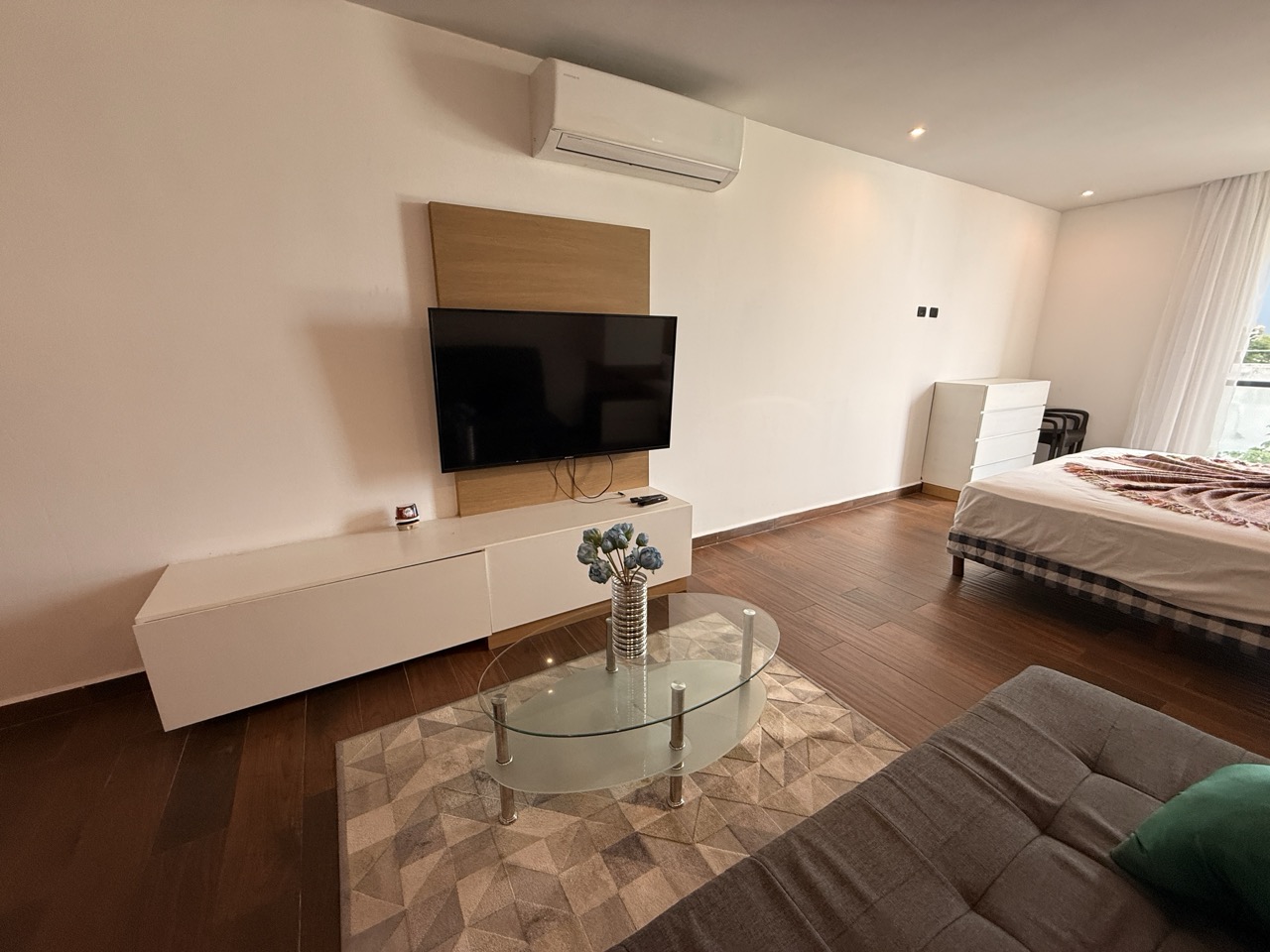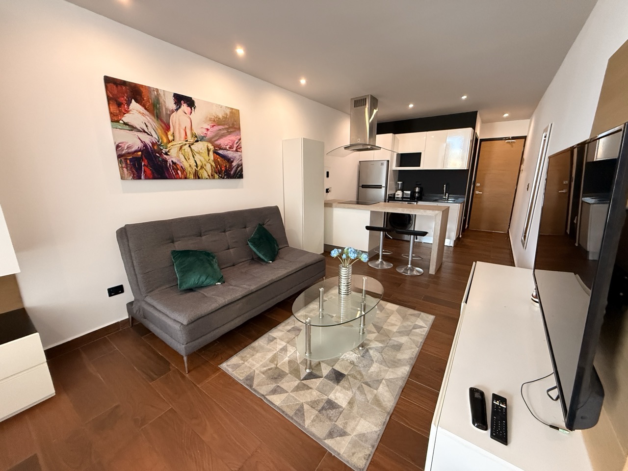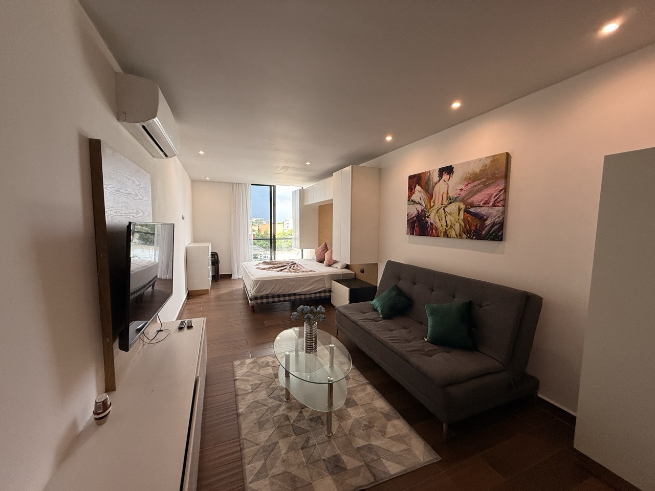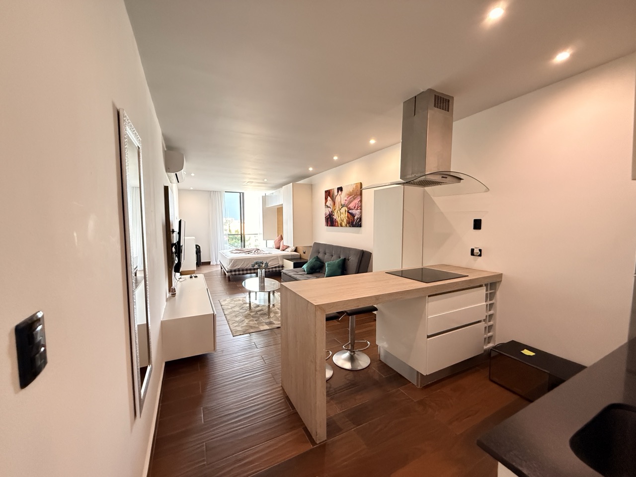 El estudio cuenta con cocineta con barra, acogedora sala, área de descanso y un balcón privado, perfecto para disfrutar del clima caribeño.