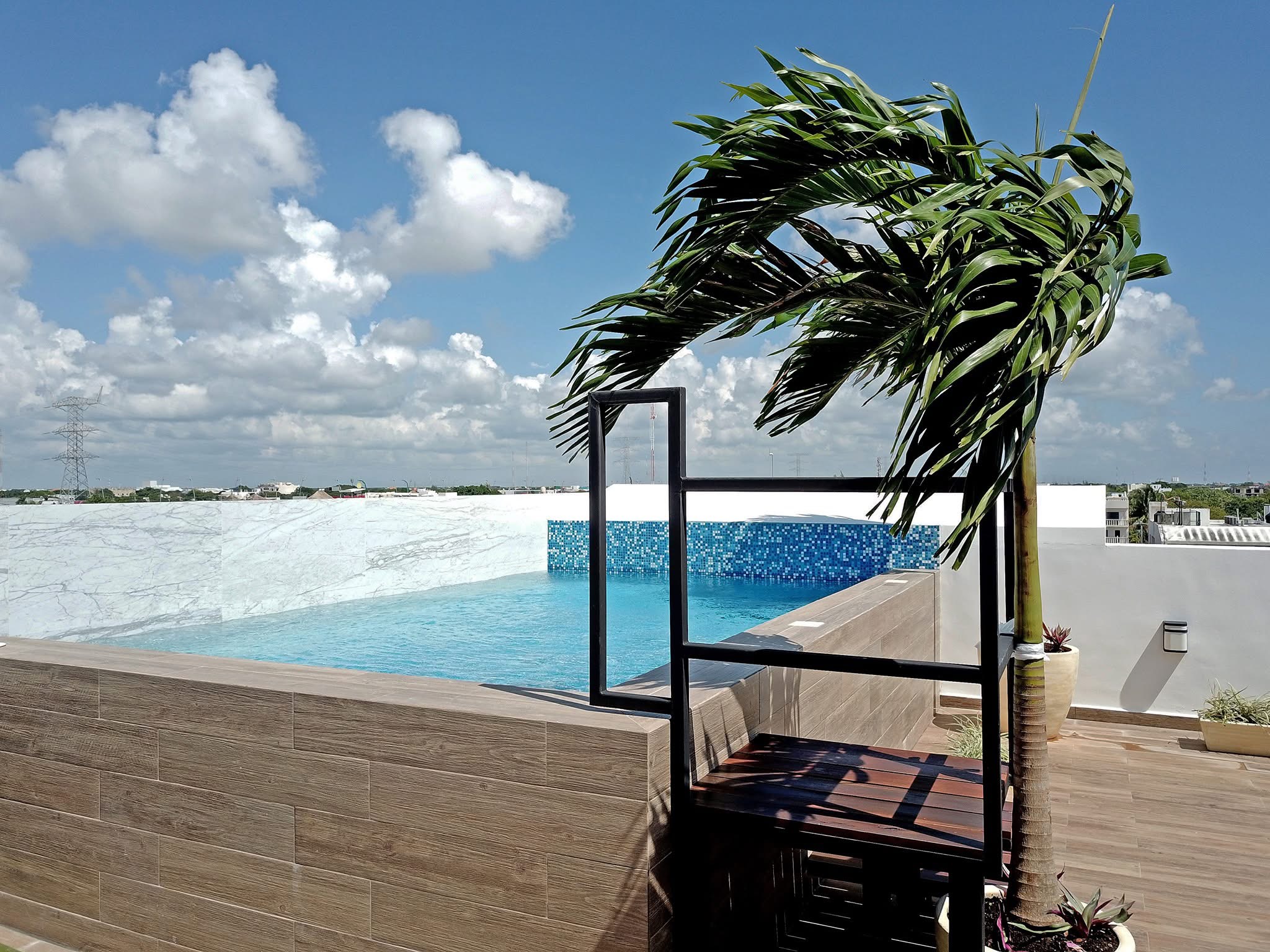 Rooftop con alberca, área de camastros y un espacio social ideal para convivir o relajarse
